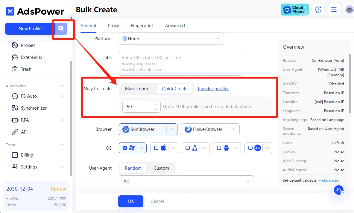 Khi cần quản lý hàng trăm tài khoản, Adspower cung cấp hai phương thức tạo hàng loạt cực kỳ hiệu quả, với giới hạn lên đến 1,000 profile mỗi lần.